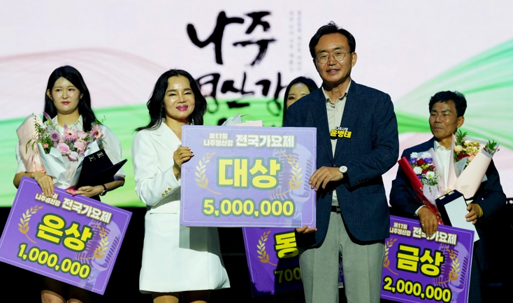 | 윤병태 시장(오른쪽)이 ‘제17회 나주 영산강 전국 가요제’에서 대상을 수상한 장성희 씨에게 상금 500만 원을 전달하고 기념사진을 찍고 있다. |
