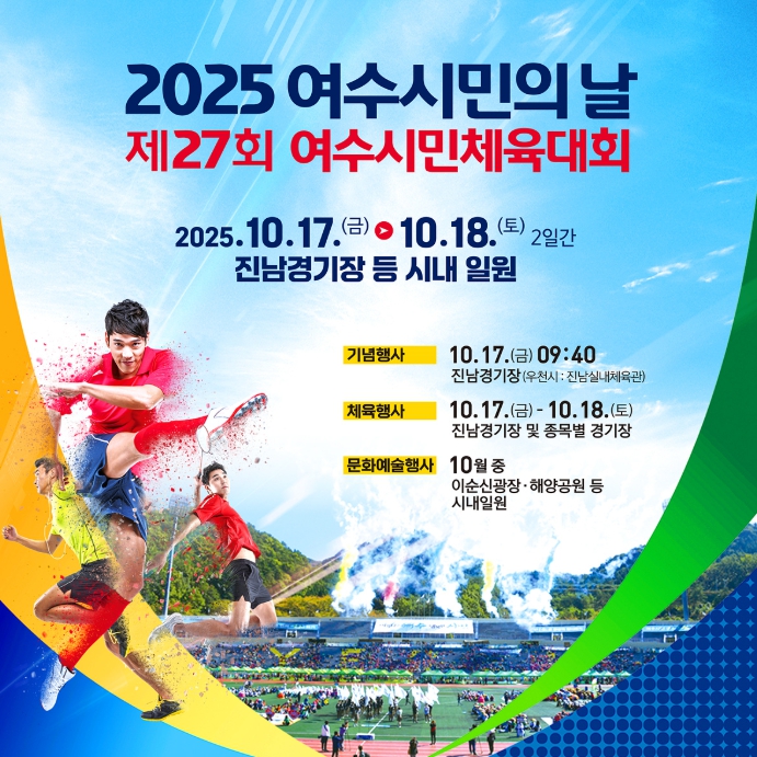 이틀간 열리는 제27회 여수시민체육대회는 15개 종목으로 치러지며 해양공원과 진남체육공원에서는 동대항 노래자랑, 전통민속놀이 경연대회 등 시민 참여형 문화행사도 다채롭게 펼쳐진다.