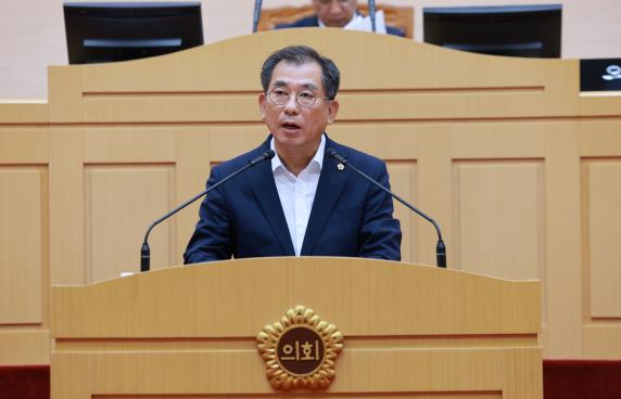 | 10월 15일 전남도의회 본회의장에서 최병용 의원이 ‘해양쓰레기 대응의 국가책임 강화 촉구 건의안’에 대한 제안설명을 하고 있다. |