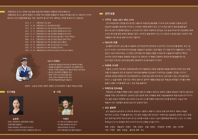 이번 공연에는 손광섭 예술감독을 비롯해 전병진, 김현우, 정명진, 김지혜, 권혁진, 이종빈, 이재웅, 박대열 등 국악인들이 함께 무대에 오른다.