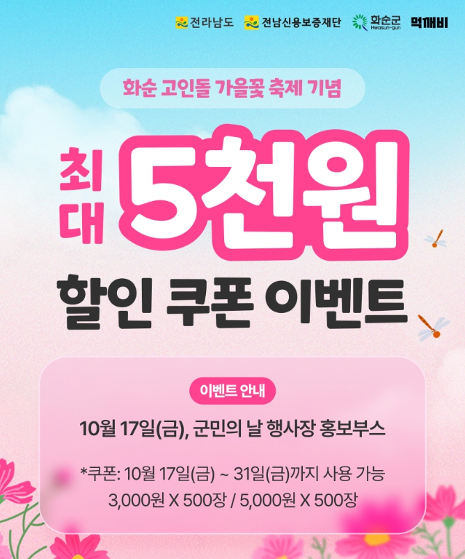 박용희 지역경제과장은 “이번 화순 고인돌 가을꽃 축제를 맞아 지역 소상공인이 상생할 수 있도록 공공배달앱 할인 이벤트를 추진한다”라며, “소상공인의 경영 안정에 도움이 되고, 지역경제를 살리는 공공배달앱 먹깨비를 많이 이용해 주시면 좋겠다”라고 말했다.