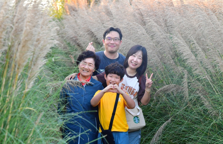 | 내려받기장성 황룡강을 찾은 가족이 팜파스 그라스 사이에서 포즈를 취했다. |