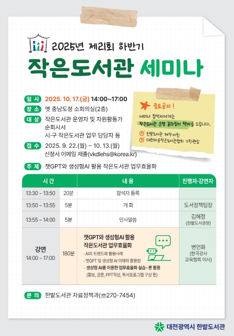 이번 세미나에는 변언화 한국강사교육협회 이사의 ‘챗GPT와 생성형AI 활용 작은도서관 업무효율화’에 대한 강연을 진행하며 ▲챗GPT 및 생성형 AI 이해와 활용법 ▲모바일 기반 업무효율화 실습(홍보, PPT, 독서프로그램 구상 등)으로 구성된다.