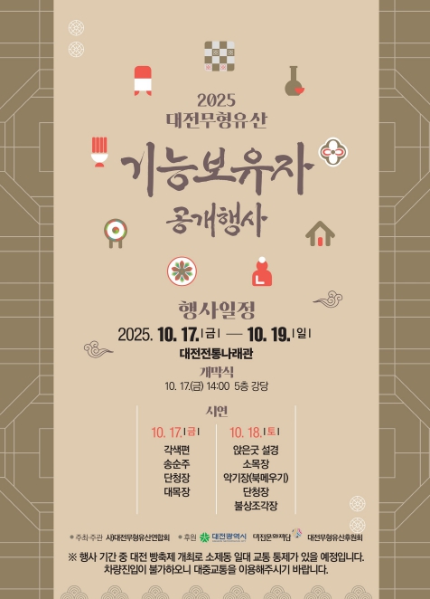 전일홍 대전시 문화예술관광국장은 “무형유산은 우리 지역의 역사와 정체성을 담아낸 소중한 자산”이라며, “이번 행사가 시민 모두가 전통의 가치를 느끼고 전승자들의 노고에 공감하는 기회가 되기를 바란다”라고 밝혔다.