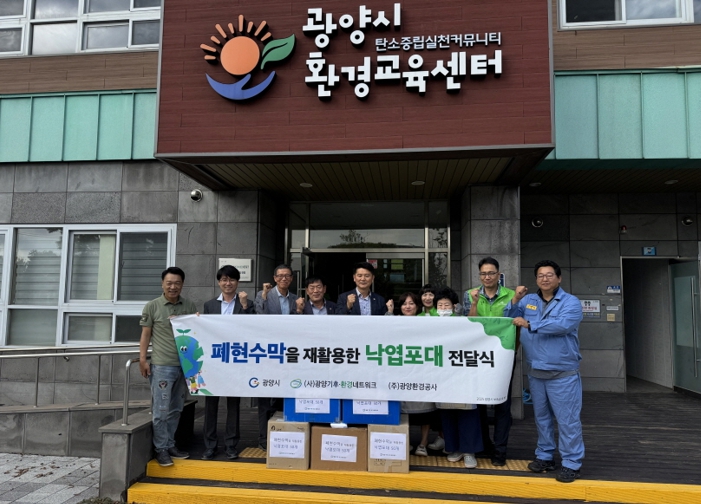 지난 10월 16일, (사)광양기후·환경네트워크는 깨끗한 거리 조성과 폐현수막 재활용 촉진을 위해 낙엽 수거용 마대 250개를 ㈜광양환경공사에 전달했다.