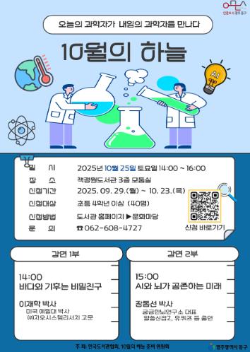 이번 10월의 하늘은 1부 지오시스템리서치 고문인 이재학 박사의 ‘바다와 기후는 비밀친구’와 2부 궁금한뇌연구소 대표이자 알쓸신잡2, 유퀴즈 등 다수의 방송에 출연한 장동선 박사의 ‘인공지능(AI)과 뇌가 공존하는 미래’로 나눠 진행된다.