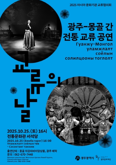 이어 오후 4시에는 전통문화관 서석당에서 몽골 차강라바이앙상블과 광주 예락이 함께하는 ‘광주-몽골의 전통 교류 공연’이 열린다. 이번 공연에서는 두 나라의전통음악과 무용, 노래, 연주가 한 무대에서 어우러지며 다채로운 예술적 교감을 선사한다.