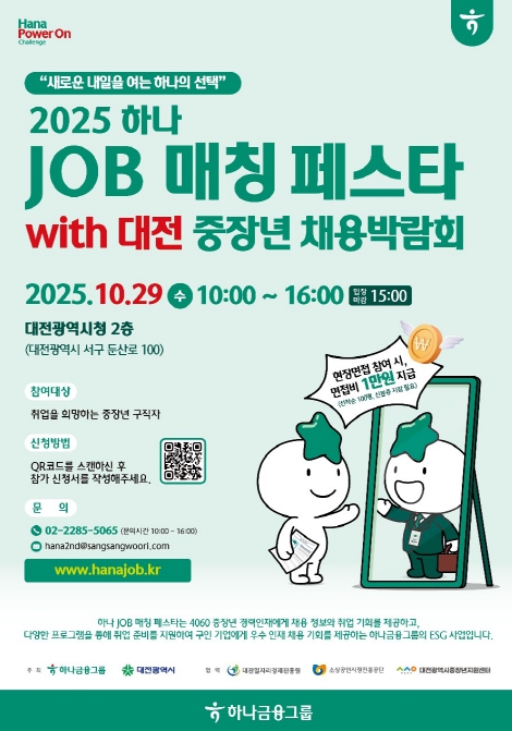 한편, 하나 JOB 매칭 페스타는 하나금융그룹이 지난해부터 전국 주요도시에서 개최해 온 대표적인 중장년층 취업박람회로, 중장년층이 재취업을 통해 제2의 인생을 설계하고, 지역 기업들이 경력 인재를 직접 발굴할 수 있는 장으로 자리매김하고 있다.