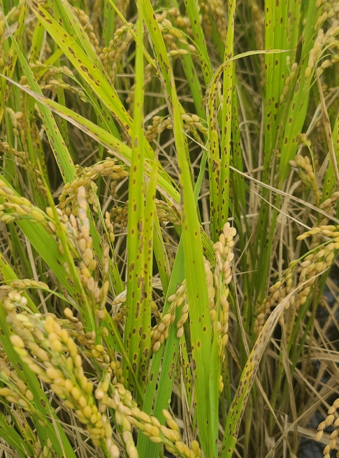 도 농기원에 따르면 올해는 벼 출수기 이후 고온과 잦은 강우가 이어지면서 ‘깨씨무늬병’이 확산되고, 이로 인해 등숙률 저하 및 쌀알 품질 저하가 우려되고 있다.