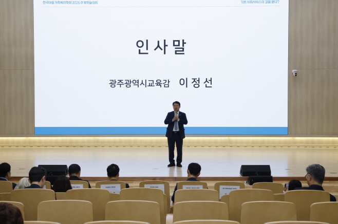 | 이정선 광주시교육감이 24일 전남대 컨벤션센터에서 진행한 ‘2025 한국아동가족복지학회 추계학술대회’에서 인사말을 하고 있다. / 광주시교육청 제공 |
