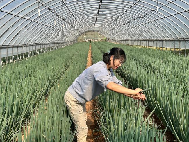 | 대파 생육 상황을 살펴보고 있는 모습. |