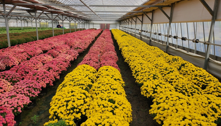 | 기술센터 내 재배된 국화 화분과 읍내 시가지에 전시중인 모습 |