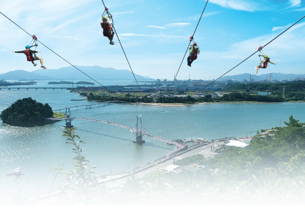 ‘섬진강 별빛스카이 공중하강체험시설’은 섬진강을 가로지르는 와이어 케이블을 따라 하강하며, 망덕포구와 배알도의 절경을 한눈에 조망할 수 있는 체험형 레포츠 시설이다.