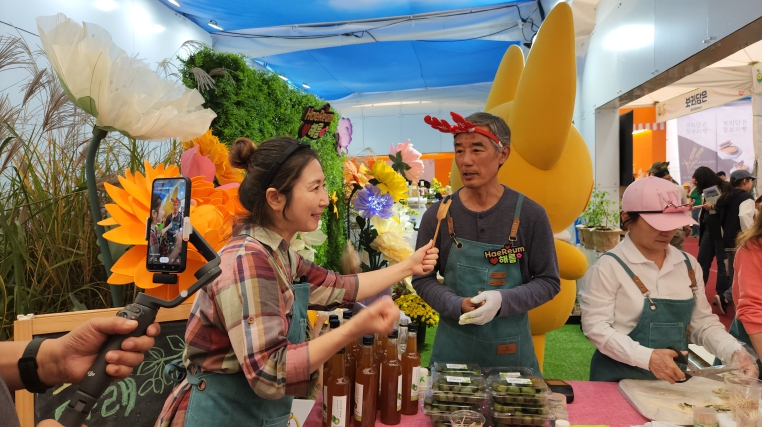 | 제농업박람회 함평홍보관 부스에서 해름 스토어 운영하는 모습과 라이브커머스 방송장면 |