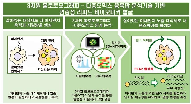 또한 연구팀은 3D 홀로토모그래피 영상기법을 통해 생세포 내 지질대사 활성을 시공간적으로 추적함으로써, 염증 반응과 지질방울 역학 변화 간의 직접적 연관성을 실험적으로 규명했다.