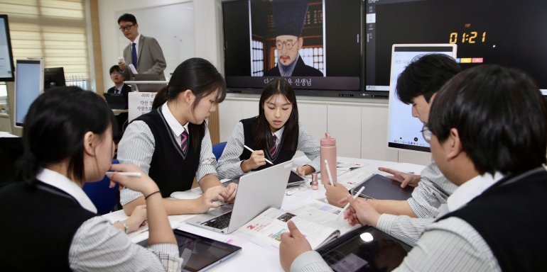 수업은 조선 후기 실학자 다산 정약용의 사상을 오늘날의 지방자치제도와 연결해, 학생들이 민주주의의 의미와 시민의 역할을 탐구하도록 설계된 통합사회·정치와 법 융합 프로젝트 수업이다. 학생들은 AI 기술을 활용해 구현된 가상의 ‘AI 정약용’과 마주 앉아 대화를 주고받으며, 민주주의와 지방자치, 시민의 역할을 탐구했다.