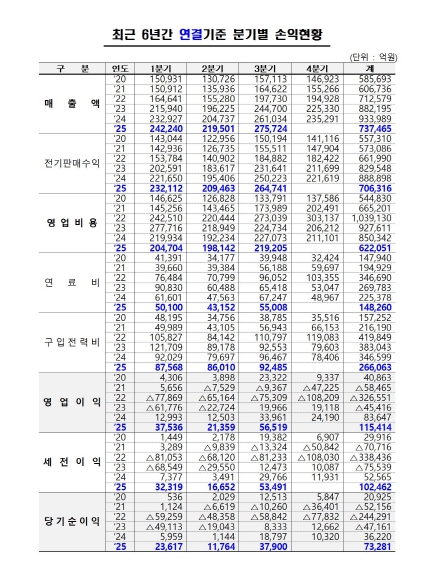 | 최근 6년간 분기별 손익현황 (연결기준) |