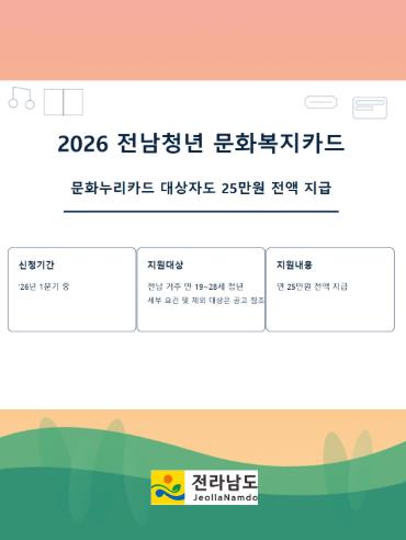 2025년 사업에는 8월까지 추가 접수를 통해 9만여 명이 혜택을 받았고, 2026년 상반기부터 전남청년 문화복지카드 신청자를 모집할 예정이다.