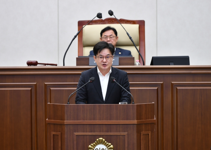 | 김병수 시장이 1일 김포시의회 제264회 임시회에서 2026년도 시정 및 운용 방향에 대한 시정연설을 하고 있다. |