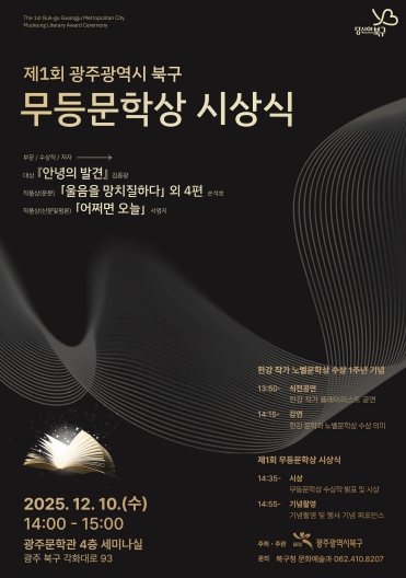 문인 북구청장은 축사를 통해 “한강 작가의 노벨문학상 수상 1주년이라는 뜻깊은 시기에 제1회 무등문학상 시상식을 개최하게 되어 더욱 의미가 크다”며, “수상자들께 진심으로 축하를 전하며 앞으로 무등문학상이 권위 있는 문학상으로 자리매김할 수 있도록 지원을 아끼지 않겠다”고 말했다.