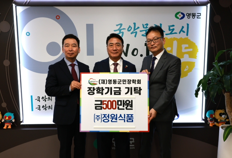 | 영동군 ㈜정원식품 CSR, 지역 미래 인재 육성을 위한 장학금 500만 원 기탁 |