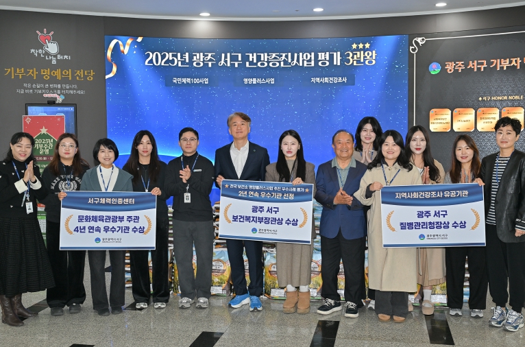 이원구 서구보건소장은 “이번 3관왕 달성은 지역민의 적극적인 참여와 직원들의 헌신적인 노력이 함께 이뤄낸 결과”라며 “앞으로도 근거 기반의 보건정책을 바탕으로 지역 특성에 맞는 건강증진사업을 지속 확대해 건강한 서구 조성에 최선을 다하겠다”고 밝혔다.