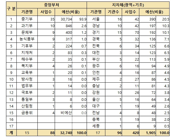 지방자치단체(광역 17개, 기초 79개)는 서울(390억원), 경남(197억원), 경기(192억원) 등에서 총 1,905억원, 420개 사업을 추진할 계획이다.