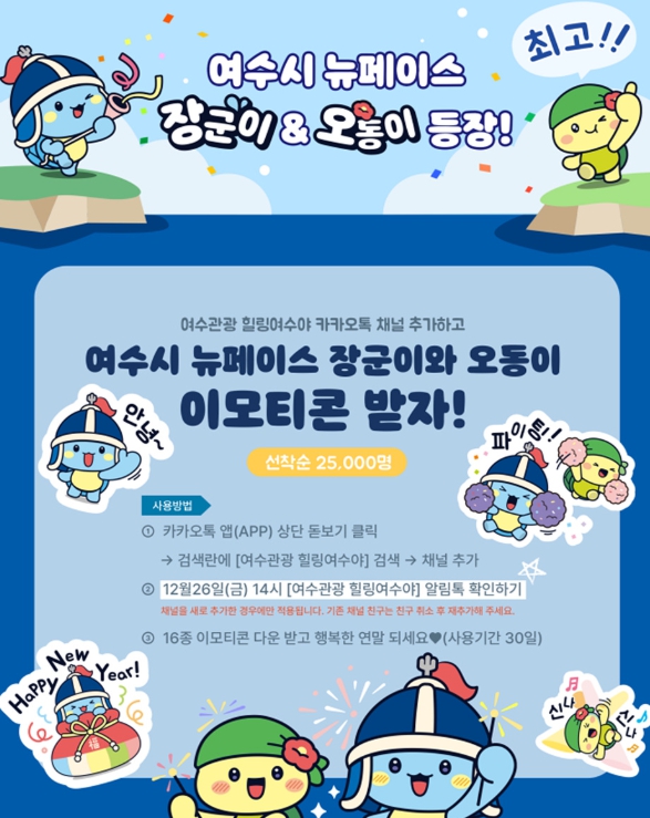 | 여수시 마스코트 ‘장군이·오동이’ 카카오톡 이모티콘 무료 배포 홍보물 |