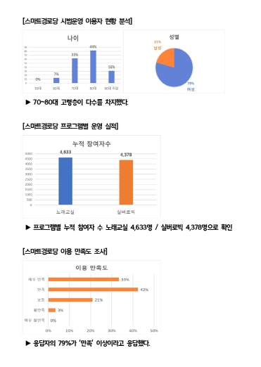 이용자 설문조사 결과에서도 긍정적인 반응이 이어졌다. 응답자의 96%가 사업 운영에 대해 긍정적(만족 이상 75%, 보통 21%)이라고 답했으며, 79%는 이후에도 계속 이용하겠다는 의사를 밝혔다. 이를 통해 사업의 지속 필요성이 확인됐고, 참여자 대부분이 70~80대 고령층으로 스마트경로당이 디지털 취약계층을 대상으로 효과적으로 운영된 것으로 분석됐다.