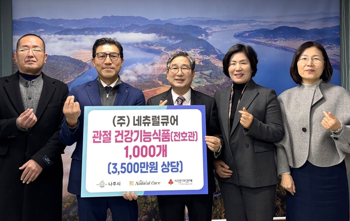 강상구 나주 부시장은 “산림 연구 성과를 바탕으로 한 건강기능식품을 연말 취약계층에 지원해 주신 ㈜네츄럴큐어와 전남산림연구원에 감사드린다”며 “기탁된 물품은 필요한 이웃들에게 소중히 전달하겠다”고 말했다.
