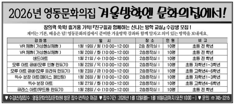 영동문화의집 관계자는 “겨울방학 기간 아이들이 재미있게 배우고 의미 있는 시간을 보낼 수 있도록 다양한 체험 프로그램을 마련했다”며 “많은 학생과 학부모의 관심과 참여를 바란다”고 말했다.