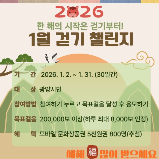 반미순 건강증진과장은 “새해 건강은 매일의 꾸준한 실천에서 시작된다”며 “1월 걷기 챌린지를 통해 새해부터 한 걸음씩 건강한 생활을 실천하길 바란다”고 말했다.