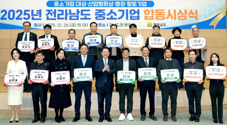 | 김영록 전라남도지사가 26일 도청 왕인실에서 열린 2025년 중소기업 합동 시상식에서 전체 수상자들과 기념촬영을 하고 있다. |