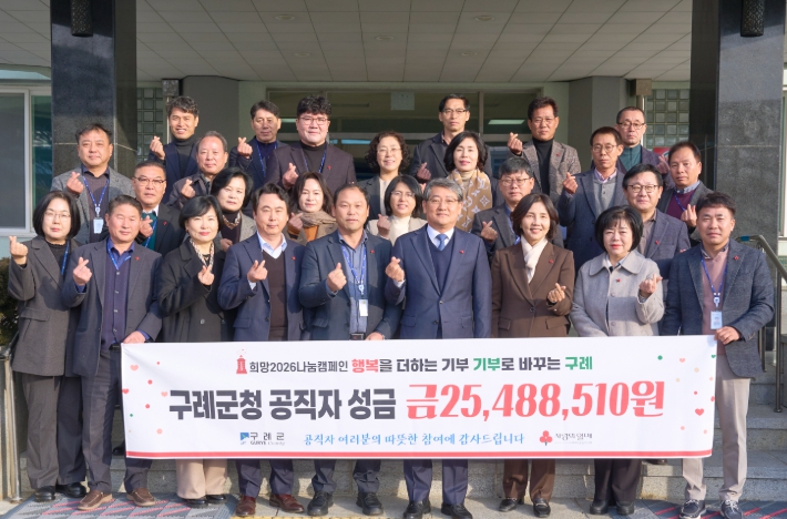 김순호 구례군수는 “공직자 한 사람 한 사람의 따뜻한 마음이 모여 큰 나눔으로 이어졌다”며 “이번 참여가 지역사회 전반에 나눔 문화가 확산되는 계기가 되길 바라며, 군민 여러분의 지속적인 관심과 동참도 부탁드린다”고 말했다.