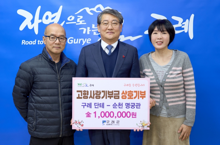 이번 상호 기부는 구례군 산동면 소재 외식업체인 단테의 노현정 대표와 순천시 명궁관의 박수영 대표가 지역발전을 위한 응원을 공감하며 이루어 졌으며, 각 100만원씩을 상호 기탁하였다.