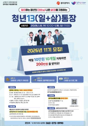 ‘청년13통장’은 19~39세 근로청년이 매월 10만원씩 10개월간 100만원을 저축하면, 광주시가 100만원을 지원해 총 200만원의 만기금과 이자를 마련할 수 있게 하는 광주시 대표 청년 금융자산 형성 지원 사업이다.