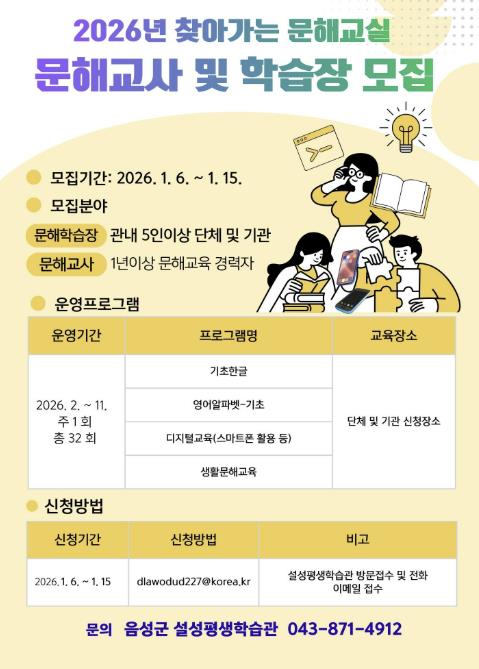 | 음성군, 2026년 찾아가는 문해교실 교사 및 학습장 모집 |