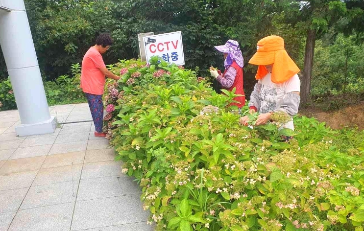 | 나주시의 2025년 하반기 지역공동체일자리사업 참가자들이 동강면에 있는 영산강 한반도 지형 전망대 주변에 핀 수국을 가꾸고 있다. |