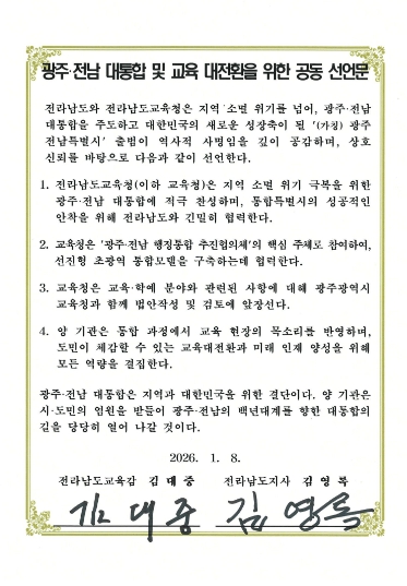 김영록 도지사는 “김대중 교육감님의 지지와 동참에 감사하고, 광주·전남 행정통합이 시도민은 물론 교육대전환과 미래인재 양성의 기반이 되도록 노력하겠다” 고 말했다.