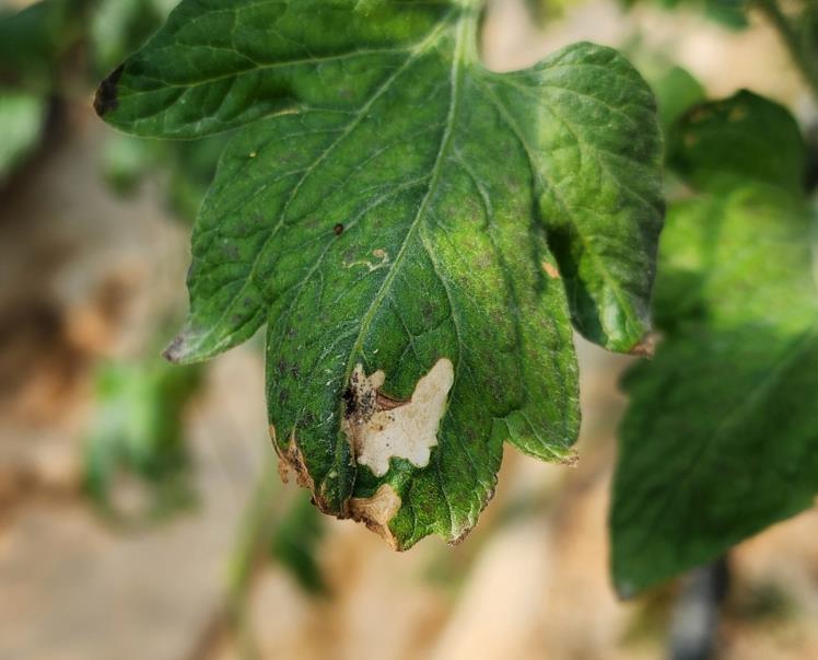 | 토마토 뿔나방 유충 피해를 본 잎. |