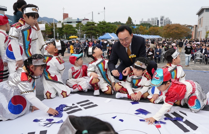 | 윤병태 시장과 아이들이 태극기 만들기 체험을 함께하고 있다 |