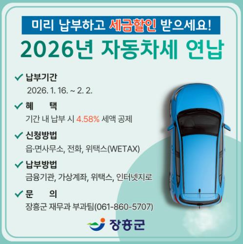 | 장흥군 “2026년 자동차세 연납하고 공제받으세요” |