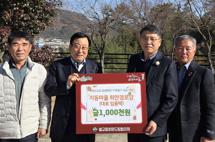 | 벌교읍 지동리 희안경로당장을 맡고 있는 임용택 씨가 ‘희망 2026 나눔 캠페인’ 성금 모금의 100번째 참여자로서 100만 원을 기탁했다(왼쪽에서 두번째_ 지동마을 희안경로당 대표 임용택, 세번째_ 벌교읍장 서진석) |
