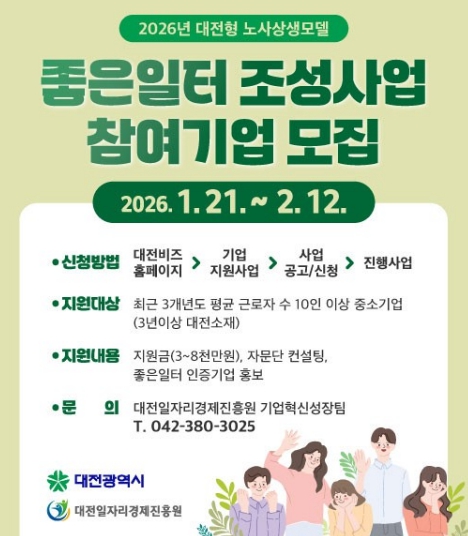 박제화 대전시 경제국장은 “좋은 일터 조성사업은 기업의 경쟁력을 높이고 노동자의 삶의 질을 개선하는 대전형 일터 혁신 모델”이라며, “노사협력 기반의 근로환경 개선에 의지가 있는 지역 기업들의 많은 참여를 바란다”라고 말했다.