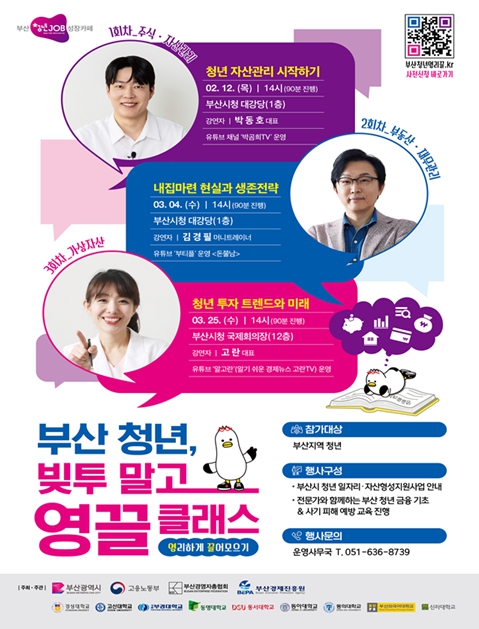 첫 강의에 참여하기를 희망하는 청년은 오늘(26일)부터 2월 10일까지 '부산청년영리끌 누리집'을 통해 사전 신청할 수 있으며, 당일 현장 접수도 가능하다.