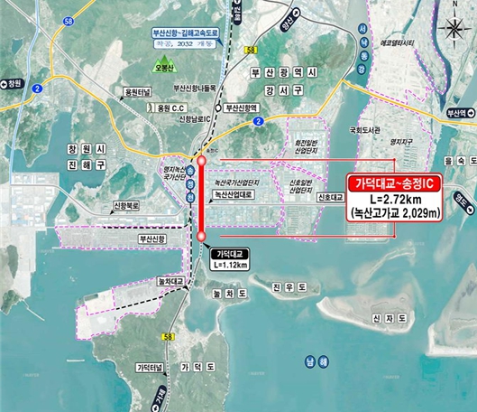 오늘 첫 삽을 뜨는 '국지도 58호선 가덕대교~송정나들목(IC) 고가도로 건설공사'는 강서구 송정동 가덕대교에서 송정나들목(IC) 까지 구간에 고가도로를 건설하는 사업이다.