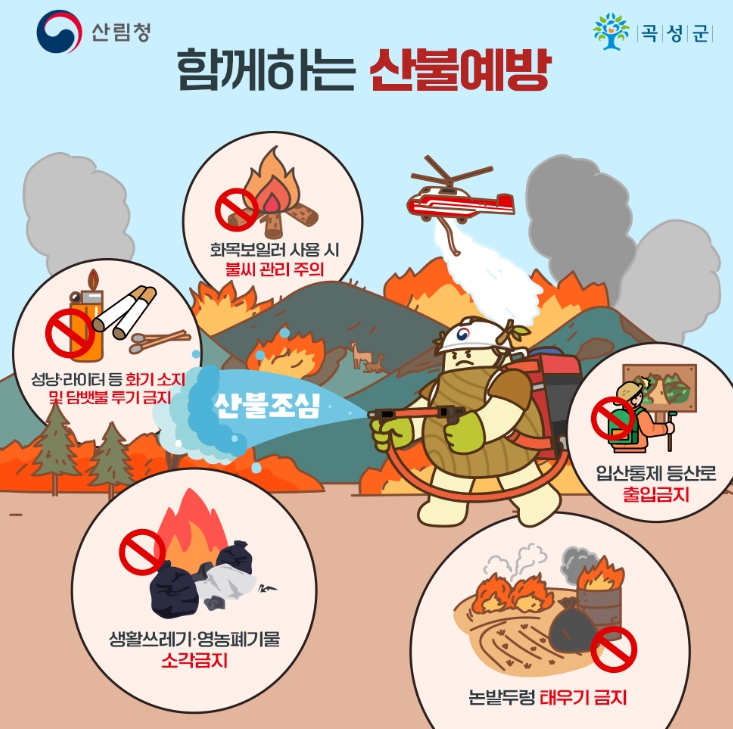 특히, 영농폐기물 및 생활쓰레기 소각 등 일상 속 작은 행동이 산불로 이어질 수 있는 만큼 군민들의 적극적인 협조가 무엇보다 중요하며, 산불 발견 시에는 즉시 119 또는 군청 상황실로 신고해 줄 것을 당부했다.