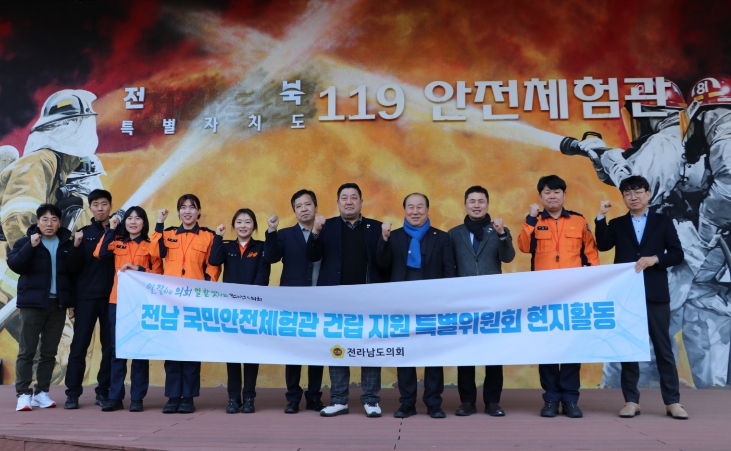 | - 전라남도의회 ‘전남 국민안전체험관 건립 지원 특별위원회’가 전북119안전체험관 운영 및 체험 프로그램에 대한 벤치마킹을실시한 뒤 기념촬영을 하고 있다. |