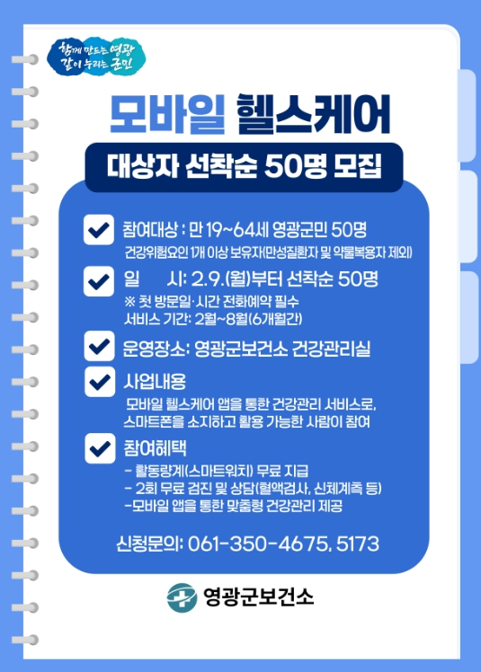 모집 대상은 혈압, 공복혈당, 허리둘레, 중성지방, HDL콜레스테롤 중 1개 이상 건강위험요인을 보유한 19세부터 64세까지의 영광군민이다.