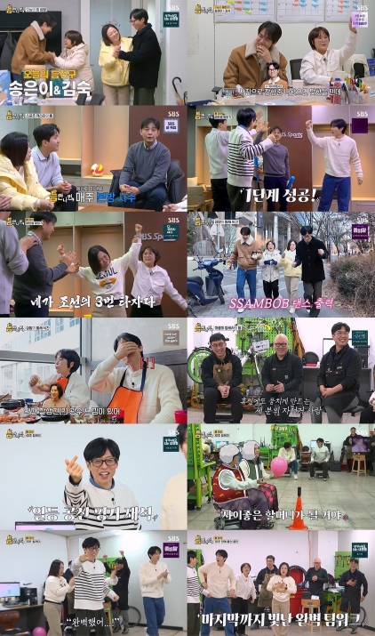 다음 틈 주인은 서울시 공유 자전거 ‘따릉이’ 정비사였다. 틈 주인들은 자전거로 뭉친 끈끈한 우정을 자랑해 훈훈함을 선사했다. 두 번째 틈 미션은 작업 의자에 앉아 릴레이로 풍선을 옮기는 ‘작업 의자 달리기’ 게임이었다. 네 사람은 엉덩방아도 불사하며 1단계를 가뿐히 통과, 2단계에서 2명씩 짝지어 이동해야 하는 룰도 소화하며 농익은 팀워크를 발휘했다. 유재석은 “우리 완벽했어”라며 감탄했다. 심지어 3단계는 4명이 주고받아야 하는 초고난도 미션이었지만, 마지막 도전에서 극적인 성공을 이뤄냈다. 네 사람은 틈 주인과 강강술래까지 돌며 기쁨을 만끽했다. 김숙은 “30년 호흡을 맞춰와서 그런지 척척 맞았다”라며 뿌듯해했고, 송은이는 “막둥아 앞으로 송형 숙형한테 편하게 연락해!”라며 마지막까지 유연석을 향한 러브콜을 보내 웃음을 자아냈다.